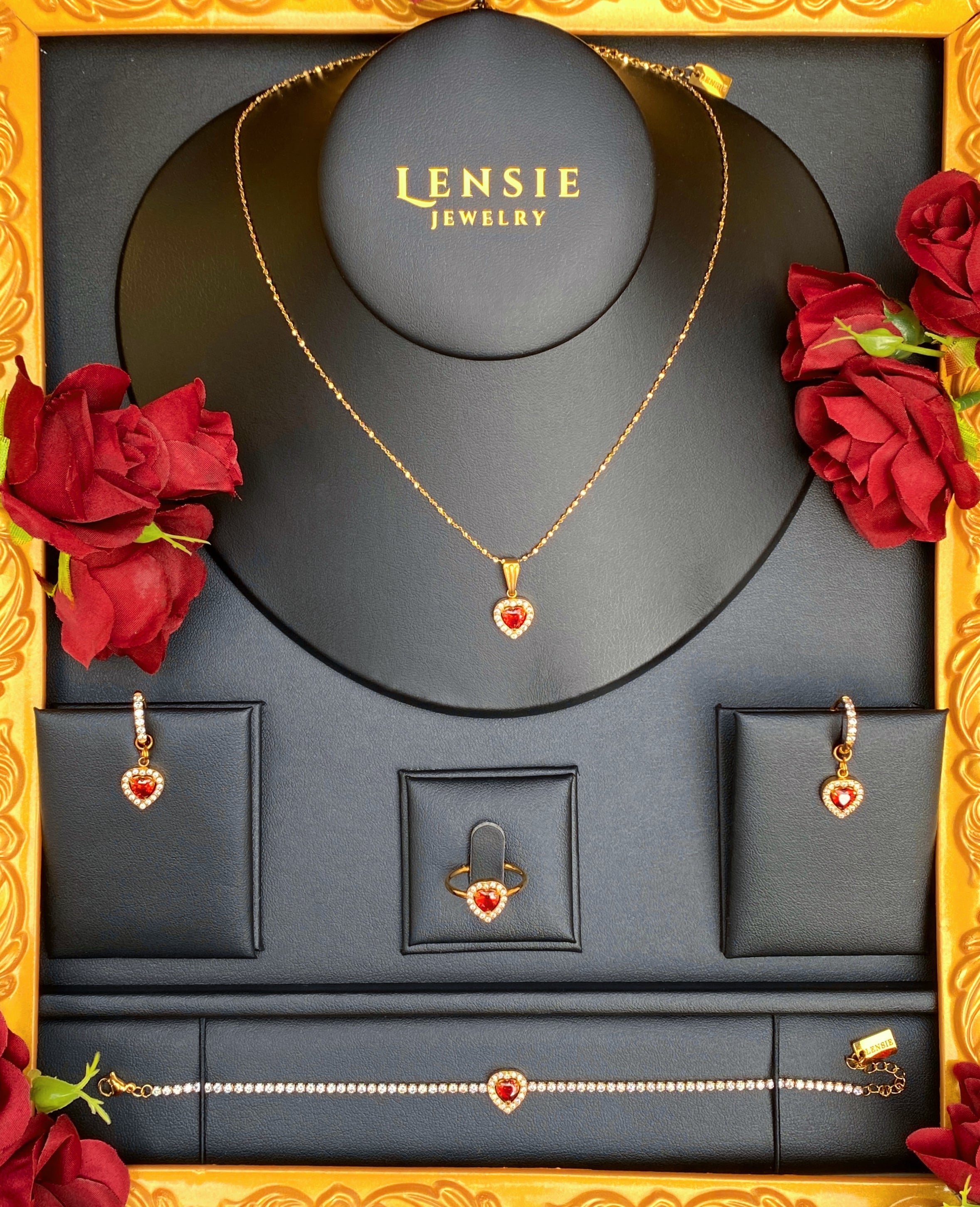 Garnet Birthstone Sparkle Jewelry Set β January Red 5A Zircon Stainless Steel Necklace, Earrings, Bracelet and Ring | Handmade | Gift for Her